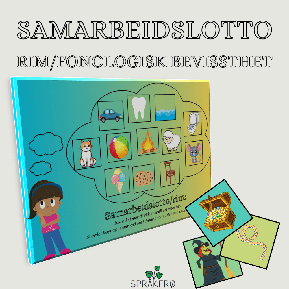 Lær barna å oppdage rim gjennom spill. Dette samarbeidsspillet er ment å stimulere fonologisk bevissthet ved at dere trekker et bildekort og vurderer sammen hvilket ord det rimer på, på brettet.