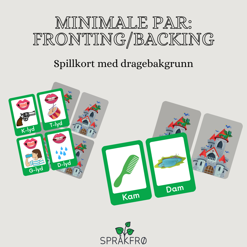 b) Barnet skal kunne manipulere og produsere ordene på spillkortene med riktig mål- eller erstatningslyd. NB. Det sistnevnte målet forutsetter ofte at barnet mestrer å produsere mål-lydene i nonord/ "tulleord" først (f.eks. kæ, gy, tu, ud). Se egne imiteringsspill på språkfrø.no.