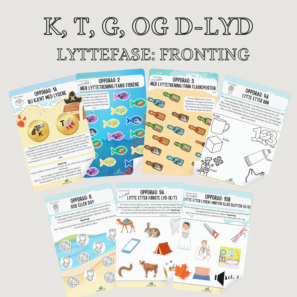 En arbeidsbok med en rekke spill og aktiviteter som adresserer alle tre faser av P.O.P.T med kontraster mellom K- og T-lyd og G- og D-lyd. Den inneholder også bruk av minimale par i enkelte aktiviteter. Boken består av 34 sider.