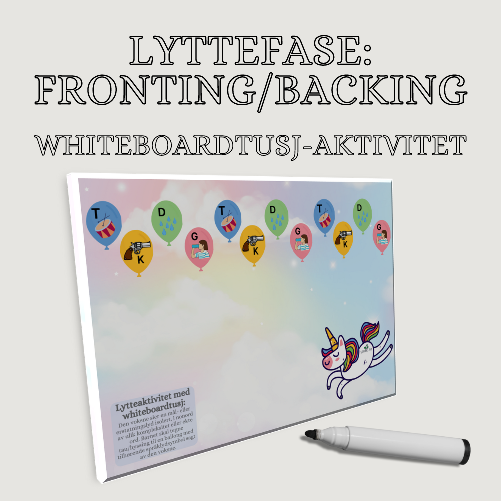 Lytteaktivitet til fronting/backing prosessen (/k/-, /t/-, /g/- og /d/-lyden) med enhjørningstema.