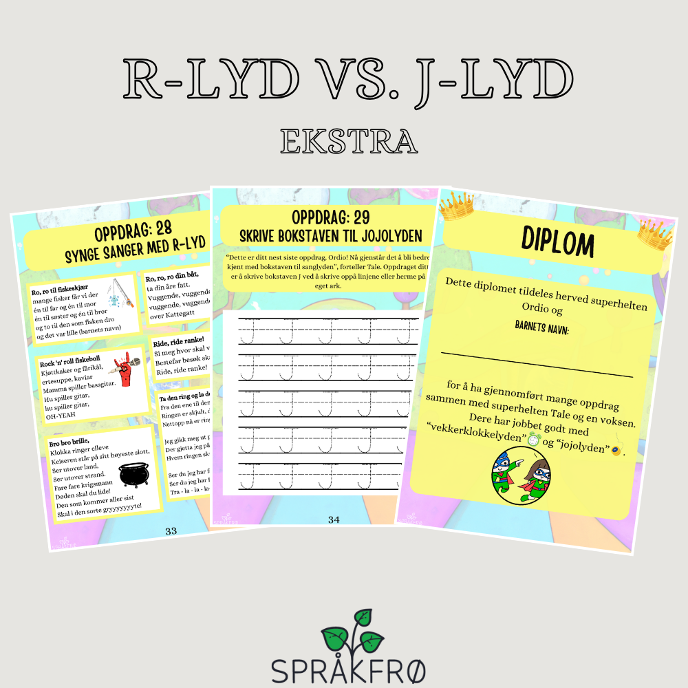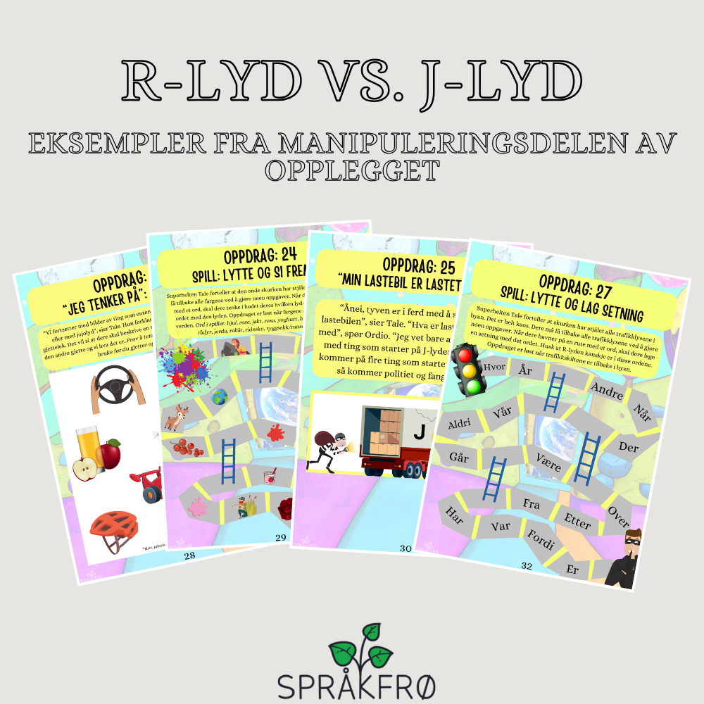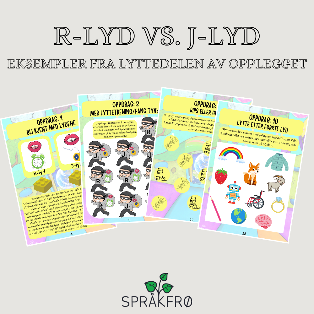 Oppdrag med fokus på fonologisk bevissthet: Barnet skal lytte og diskriminere forskjell mellom /R/- og /J/-lyd sagt hver for seg, i “tulleord” av ulik kompleksitet (f.eks. jø, ru, jæ, ræ) og i «ekte ord» (f.eks. rift og gift, uttalt som jift).