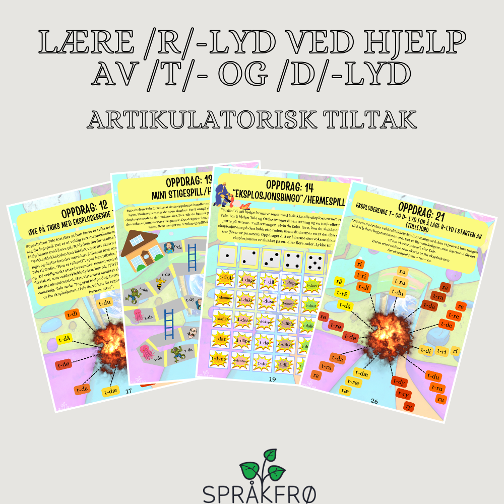 - Oppdrag for barn med artikulatoriske utfordringer med /R/-lyd: Barnet skal mestre å si /T/- og /D/-lyd eksploderende raskt etter hverandre i “tulleord” (f.eks. t-dæ, t-dy) og i “ekte ord” (f.eks. t-doll for troll) for å lære /R/-lyd.