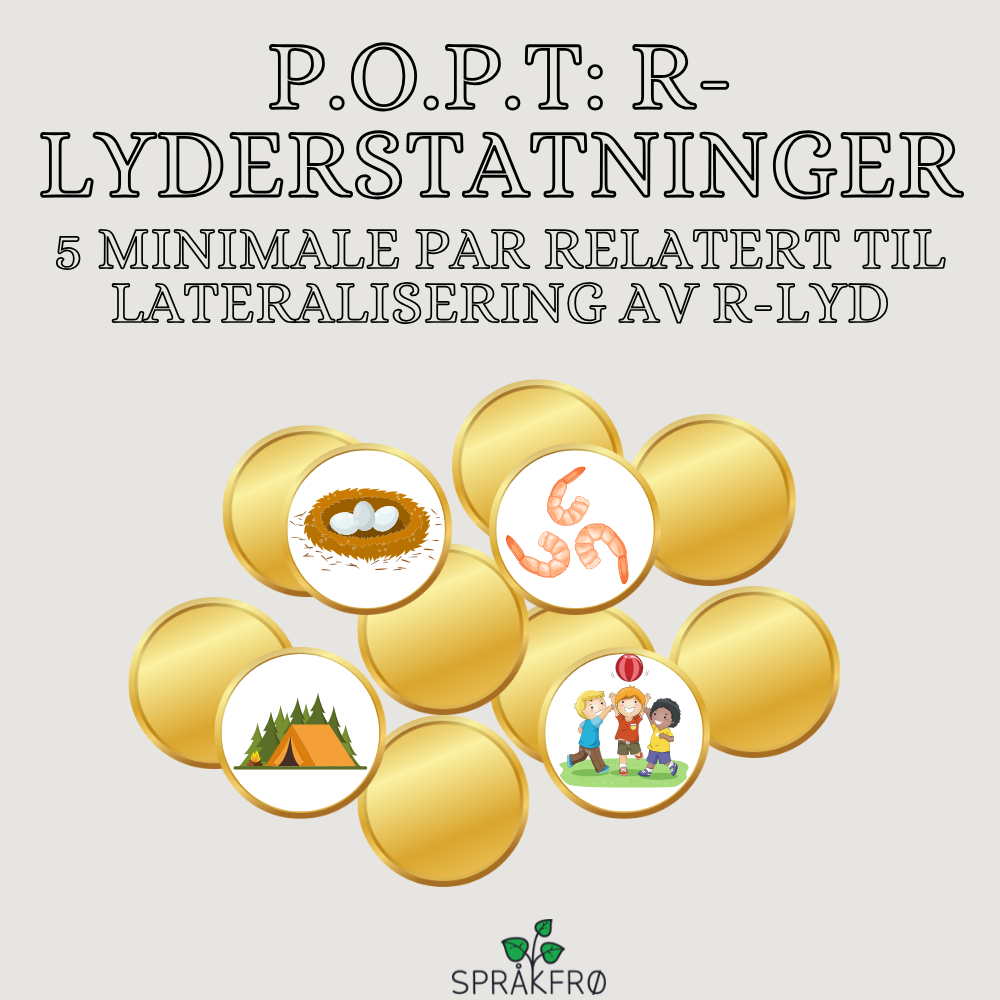 Fonologisk materiell knyttet til R-lyderstatninger ("gliding av r-lyd" og "lateralisering av r-lyd"). Kan brukes til lyttefase av P.O.P.T, produksjon av lydene hver for seg, samt produksjon av meningsfulle ord/minimale par.