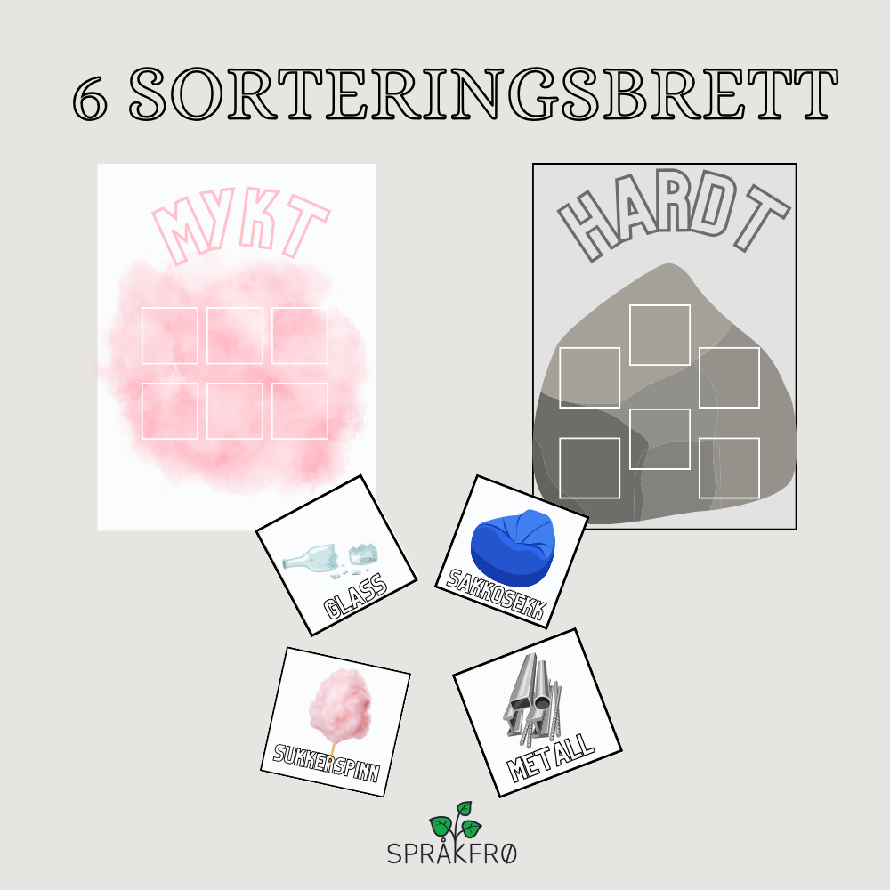 - 2 sorteringsbrett relatert til begrepene mykt/hardt, inkl. spillkort med relevante ord.